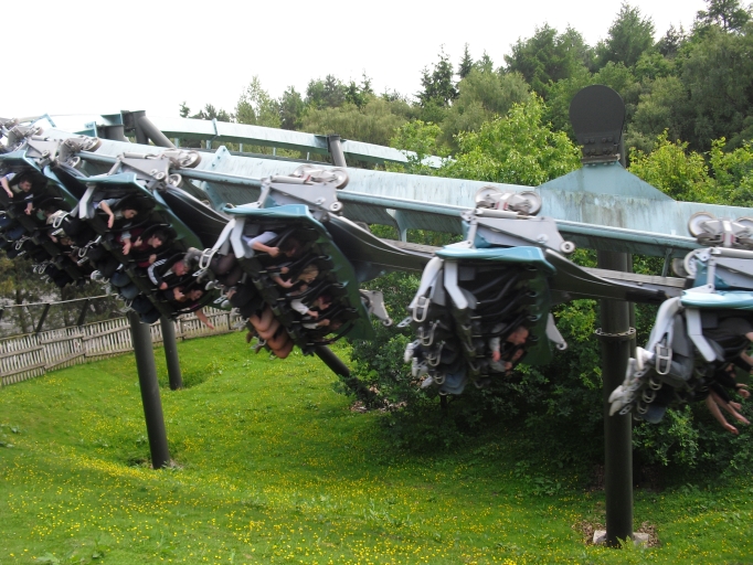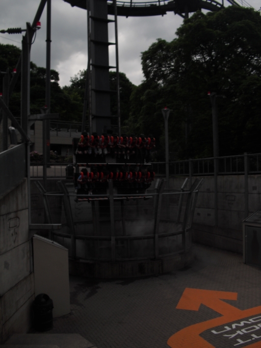 Welcome to the unknown! Dort erwartete uns mit Oblivion ein einzigartiger Freefall-Coaster. In breiten Wägen wird man zum Abhang gezogen, wo man dann 3 Sekunden praktisch in der Senkrechten verbringt. In dieser Stellung wird ein paar Sekunden "geparkt"... Dann lösen sich die Bremsen und es geht per Freefall in ein schwarzes Loch im Boden, gefolgt von einem Tunnel. Gerade beim ersten Ride treibt das ordentlich den Puls in die Höhe. ...danach geht es im freien Fall in ein schwarzes Loch! Im Anschluss ging es mit Submission und Enterprise zurück in die Höhe, auch wenn beide Fahrgeschäfte nicht die Spektakularität von Oblivion aufweisen konnten. Lustig und übel-machend (Kareen: "Es steht mir bis genau hier." war die Fahrt aber alle Mal. Zumindest 2 von uns 3 hatten in "Submission" viel Spass! "Enterprise" entpuppte sich trotz spektakulärem Aussehen als eher gemütliche Attraktion. Danach machten wir uns auf den Weg nach Forbidden Valley. Hierzu mussten wir allerdings erst Mutiny Bay (was allerdings kein Problem war, da es hier praktisch nur Wasser-Attraktionen gab), Katanga Canyon (wo wir dem Runaway Mine Train, einer elektrischen langsamen, aber lustigen Achterbahn einen Besuch abstatteten) und Gloomy Wood passieren. Tschuuuuuu Tschuuuuuu! Bei Letzterem mussten wir dann aber doch einen längeren Zwischenstopp einlegen und das Duell-Geisterhaus besuchen. Hier musste man in einer Geisterbahn sitzend auf Zombies, Spinnen und anderes Gedöhns schießen. Ganz spaßig, allerdings kam durch das Dauer-Geballere leider kein Grusel-Feeling auf (obwohl man mit besonders präzisen Treffern zusätzliche Erschreck-Elemente auslösen konnte). Stylisch (aber nicht sonderlich Furcht einjagend: Zombis mit Laser-Kanonen Dann hatten wir endlich Forbidden Valley und damit zweit weitere Hauptattraktionen erreicht: Nemesis und Air. Da die Nemesis-Warteschlange mittlerweile nur noch mit 30 Minuten angezeigt war, wurde dieser Inverted-Coaster unsere erste Wahl. Nach 20 Minuten in der Warteschlange und der Unfähigkeit der Engländer, die "erste Reihe"-Schlange selbstständig zu befüllen, fanden wir uns in der ersten Reihe von Nemesis wieder und ich zudem meinen "Coaster des Parks". Bereits am Einstieg wurde viel Wert auf den "Used"-Look gelegt. Hier stimmte wirklich alles: unglaublich gut im Alien-Stil dekoriert (inklusive verpuppten Schienen-Stücken und blutigen Wasserfällen), ein verworrener Streckenverlauf und vor allem vielen Streckenelementen (2 Corkscrew, 1 Looping, 1 Zero-G-Roll) führten zu einem wahnsinnigen Erlebnis. Up in the air: Nemesis Direkt danach ging es beim, meiner Meinung nach, zweitbesten Coaster des Parks weiter: Air.